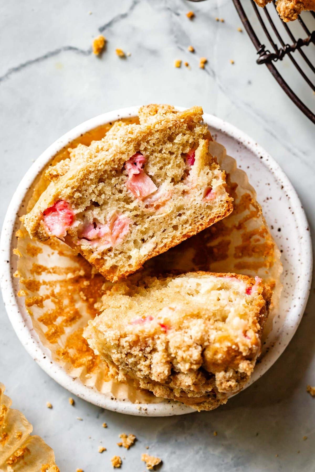 Moist and tender muffins bursting with chopped fresh or frozen rhubarb and topped with buttery brown sugar cinnamon streusel.